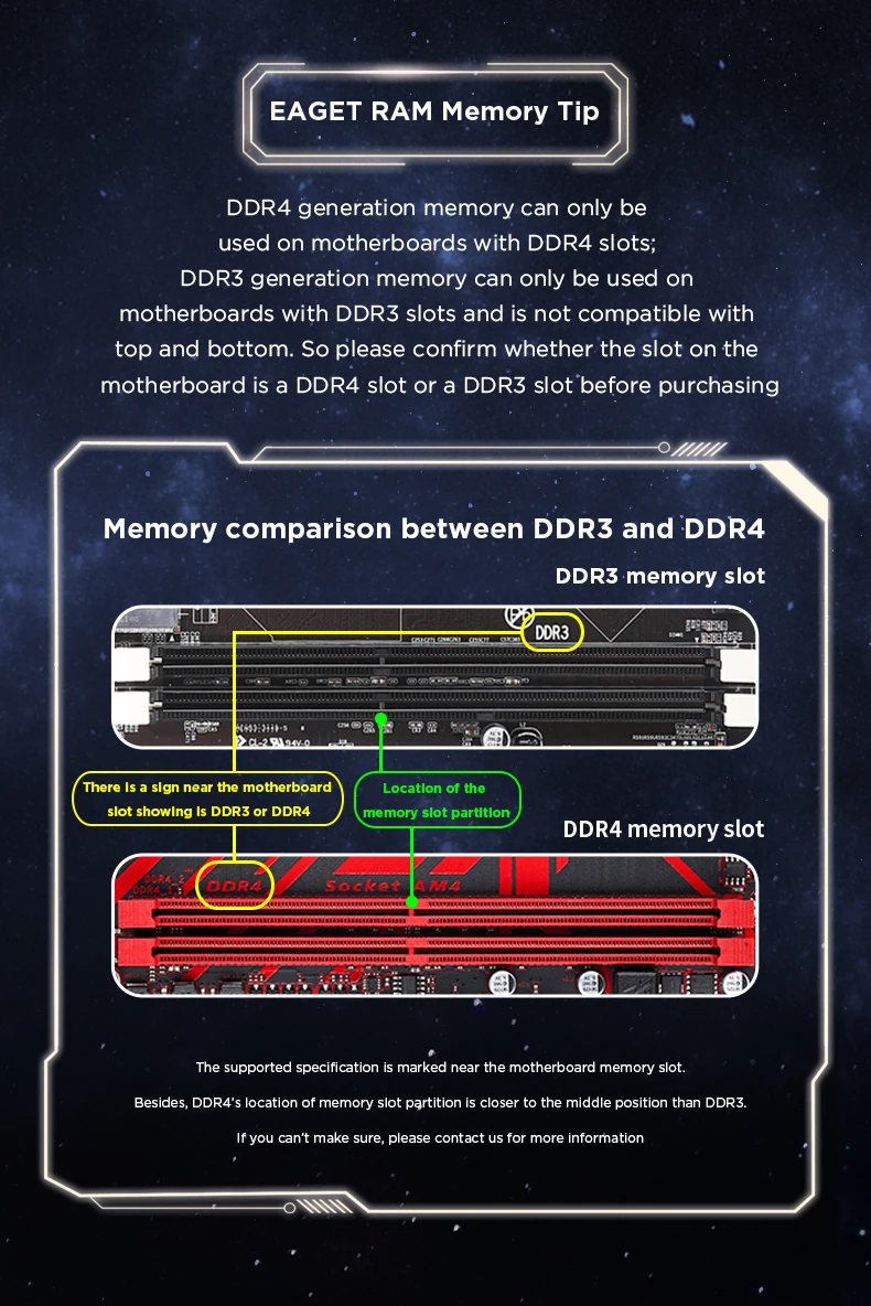 DDR4 generation memory can only be used on motherboards with DDR4 slots;DDR3 generation memory can only be used onmotherboards with DDR3 slots and is not compatible withtop and battom, So please confirm whether the slot on themotherboard is a DORd slot or a DDR3 slot befere purchasing